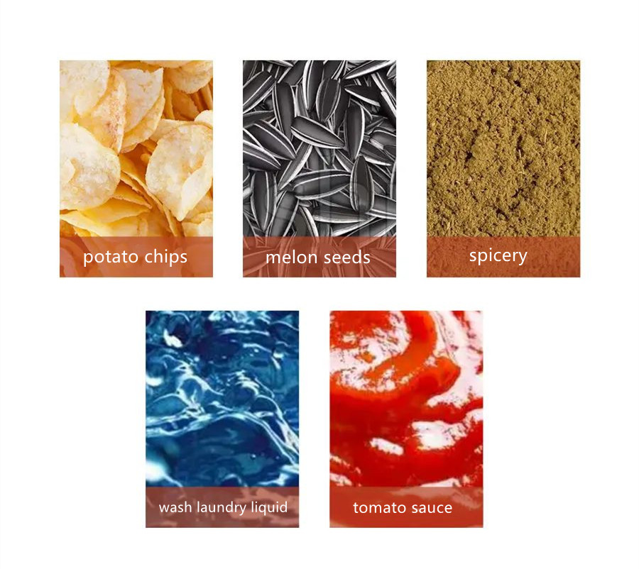 - Tout kalite manje lwazi nan lavi ka anbale ak machin sak pre-fèt, pa sèlman ka anbale poud patikil, men tou ka anbale likid ak kò kolan! Tankou chips pòmdetè, grenn melon, epis, savon lesiv, sòs tomat ak elatriye.